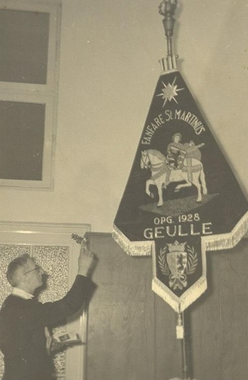 De foto vertoont het vaandelwijdingsfeest, 3 april 1955. De wijding werd verricht door Pastoor Stassen.