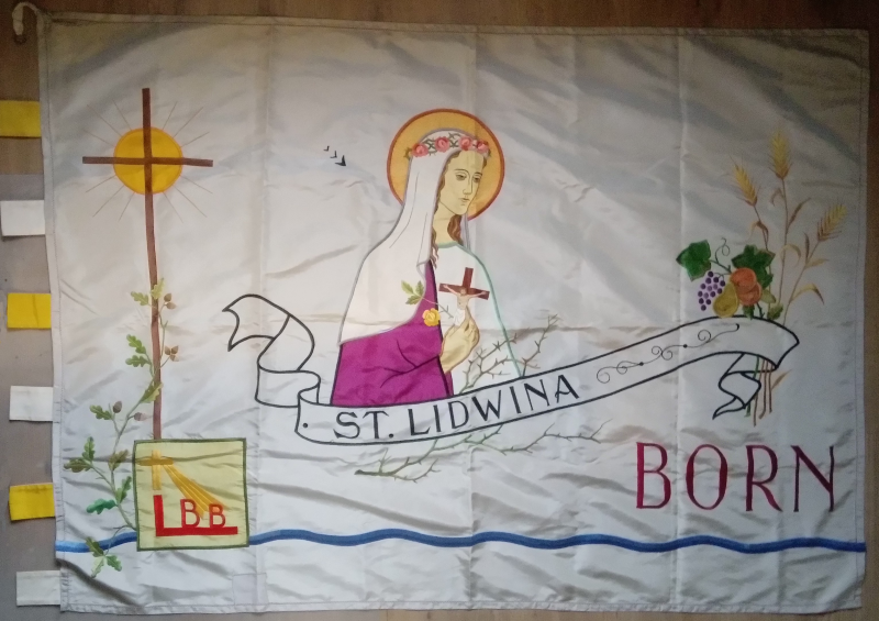 De patroonheilige, haar naam op een banderol, met veldgewas en een kruis op LBB-logo met eikenrank. Acher het kruis een stralende zon. Onder het geheel een golvende blauwe lijn (de Maas)