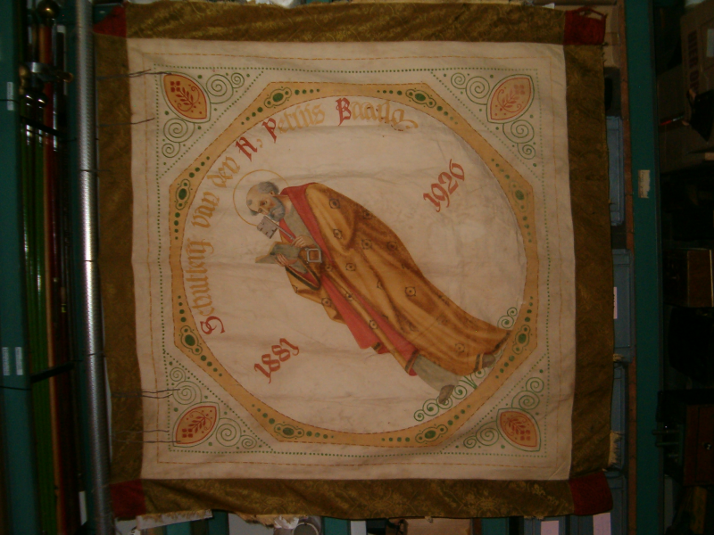 Het vaandel bestaat uit een 10cm brede groen bruine buiten rand met in geweven bloemmotieven, op de vier hoeken scharlaken rode vierkanten met ook motieven ingeweven aangebracht deze 4 hoeken zijn zwaar beschadigd zijn. De diagonale centrale lijn van het vaandel loopt van linksboven naar rechtsonder. Het midden vlak is overwegend beige van kleur, rond om en op de hoeken zijn diverse motieven aangebracht in de kleuren groen, oker en rood waardoor er een achthoek ontstaat afgebakend door een streepstippellijn, hierbinnen is een cirkel getrokken met streep stippellijn. Het vlak tussen de achthoek en cirkel is gekleurd in oker. In het midden staat een afbeelding van de Heilige Petrus met in zijn linkerhand een sleutel en de rechterhand een boek. De mantel die de H. Petrus draagt is in de kleur bruin met cirkelvormige figuren, de voering is in de kleur rood. Op de andere zijde is binnen het vlak van de achthoek op de maat van het cirkelvormige vlak en doek genaaid hierdoor is het vaandel dubbelwandig geworden, op het oker kleurig cirkelvormig doek is een cirkelvormig medaillon van de H. Antonius genaaid. Het medaillon is afkomstig van het vaandel van Schutterij St. Antonius welke opgericht is in 1907 en waarschijnlijk voortkomt uit de Schutterij St. Petrus. Het medaillon is geschilderd op doek door Gert. Hutjens - Koenen ,er staat ook een jaartal op wat echter niet leesbaar meer is. De H. Antonius wordt afgebeeld tot aan zijn middel met een bruine pij, rond zijn hoofd een aureool en haar krans, het geheel is omgeven door een geel geverfd vlak.
