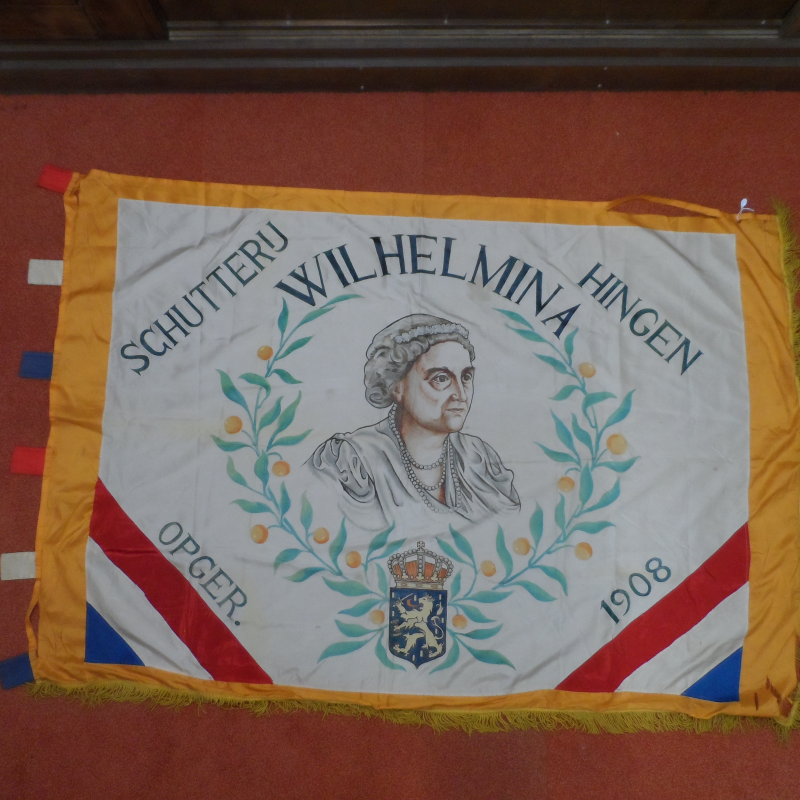 Witte vlag met oranje omzoomd. In de hoeken onderaan de rood wit blauwe banen. Centraal de beeltenis van koningin Wilhelmina, omgeven door een groene lauwerkrans met oranje vruchten, komend vanuit het Nederlands wapenschild, gedekt met kroon.