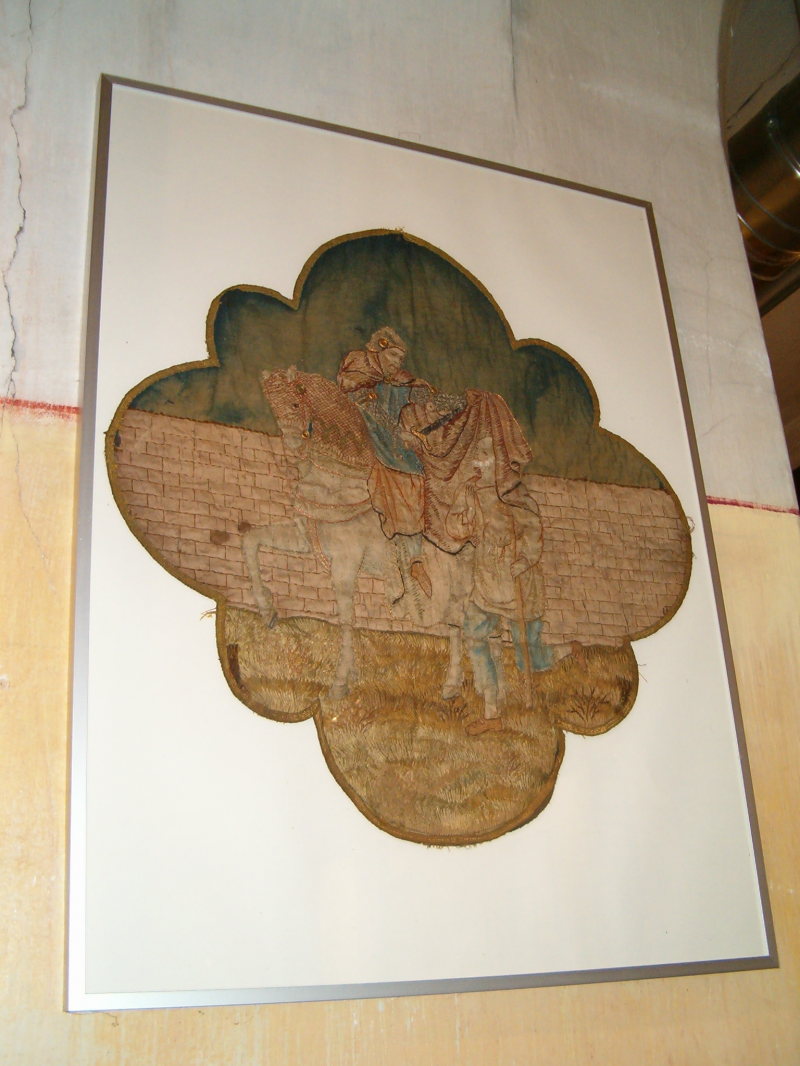 Omtrek in 8 schulpen, goud ombiest, bovenste vlak in donkerblauw, middenvlak roze blokjes als een stenen muur, onderste vlak grastapijt in div. tinten groen, paard, hoofd en hals in roze netwerk, tuig in rood en goud, paard schimmel, St. Martinus op hoofd een kapje met gouden diadeem, onderkleed in blauw, opperkleed in roze-beige-grijs met goud, bedelaar kijkend naar rechts, hoofd kaal, zilveren baard, rechterhand opgeheven, linkerhand steunend op kruk, gekleed in beige jak met koord en blauwe ingeknipte broek.