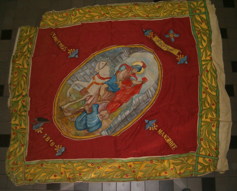 Aan de 4 randen is een brede strook, waarop een bladerenmotief is aangebracht. Het bladerenmotief is groen van kleur. De achtergrond is geel van kleur en er zijn rode bolletjes op geverfd met midden daarin een witte streep. Aan één zijde is bovendien een verstevigingrand bevestigd. Aan een van de 4 kanten ontbreekt een stuk van de rand. Binnen de randen zien we centraal binnen een ellips de afbeelding van St. Martinus die zijn mantel schijnt te delen met een op de grond liggende man. Om die ellips heen heeft het vaandel een bordeauxrode kleur. Op die bordeauxrode stof ziet men in blauw en geel verschillende vormpjes en teksten.