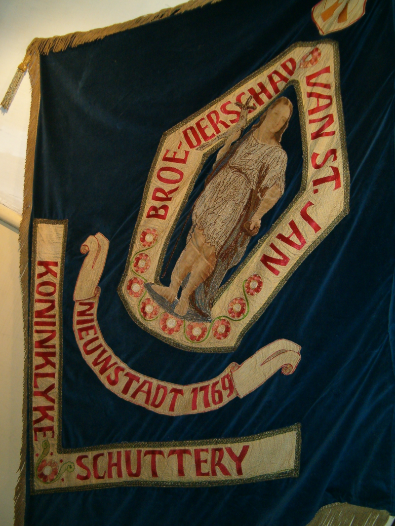 Wapenschild met daarin twee naast elkaar staande geweren, schild is beige, omzoomd met rode bies, geweren okergeel; daaronder omlijsting met tekst waarin figuur, in linkerhand een nap, in rechterhoud een kruisbanier