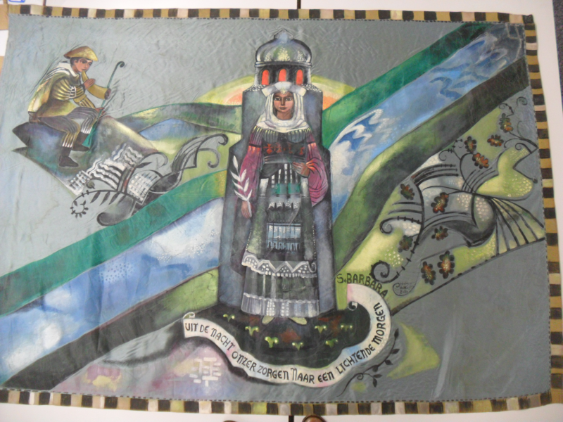 Op de keerzijde, niet op de foto te zien, staat ook het figuur St. Barbara, maar in een andere kleur uitgevoerd. Ook staat op de keerzijde de tekst “1964 - H.K.(Harry Kreykamp) - E.S.(Ella Sliedrecht)” dit zijn de initialen van de makers van dit vaandel.