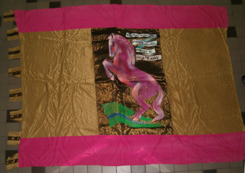 Centraal een slapend steigerend paard. Het paard heeft een mengeling van oranje, zwart en roze kleur. De achtergrond hierbij is zwart.