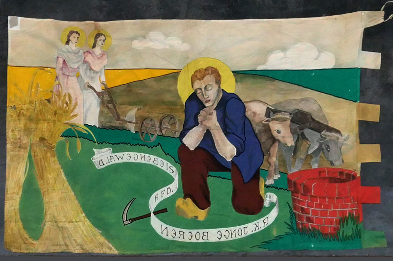De verenigingsnaam in banderol; scène uit de Isidorus-legende: de heilige (patroon van de boeren, gekleed als moderne boer) in gebed verzonken op een akker met graanschoven en waterput; op de achtergrond geleiden twee engelen de met ossen bespannen ploeg.