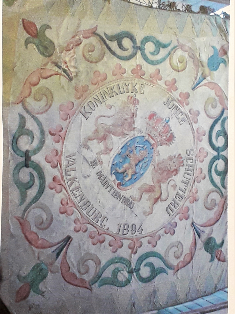Schuinse weergave in een cirkel van het Nederlands rijkswapen in ovaal en gekroond, met twee leeuwen als schildhouders en met “JE MAINTIENDRAI” op banderole eronder. De cirkel wordt geaccentueerd door rode klavertjes drie. Hieromheen op de vier punten een soort tulpornament, verbonden door rode, groene en gele accolades en bogen.