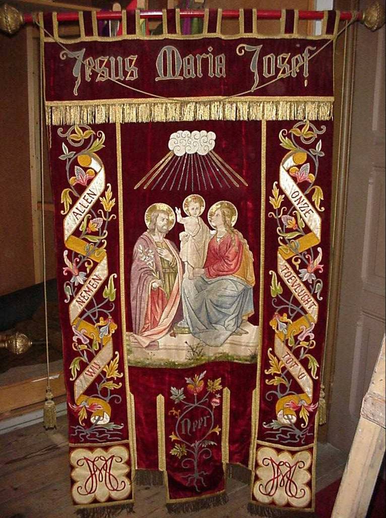 Het inwijdingsfeest van het aangeschafte vaandel vond plaats op zondag, 13 juli 1913. Het vaandel werd door alle leden in optocht afgehaald bij de kapelanie onder begeleiding van de fanfare. In de kerk aangekomen, werd het ingepakte vaandel op het priesterkoor opgesteld. Eerst vond een ‘gewone vergadering’ plaats die geleid werd door pater Lubbers, die ook de feestrede hield. Na de leden “hulde en dank gebracht te hebben voor hunne milddadigheid” verzocht hij de directeur over te gaan tot de onthulling van het vaandel. Secretaris Breukers beschrijft de onthulling van het vaandel als volgt: “En daar prijkte het in volle pracht ten aanschouwe der bewonderende leden en nieuwsgierigen die toegestroomd waren om deze grootsche plechtigheid bij te wonen. Na het met gloed gezongen lied ‘Omhoog de vaan!’ zette de eerw. Pater zijne feestrede voort en spoorde in gloedvolle taal de leden aan steeds trouw te blijven aan hun vaandel en dikwijls de spreuk te herhalen die in gulden letters daarop schitteren om het beeld van het Heilig Drietal - Jezus, Maria, Joseph, wij nemen allen onzen toevlucht tot U.”