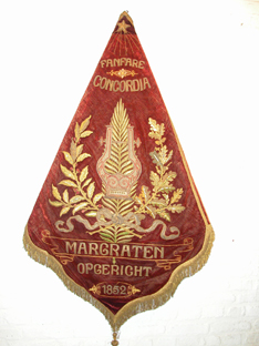 in de top een gouden ster. Onder 'Fanfare Concordia' een harp met tekst in goud.