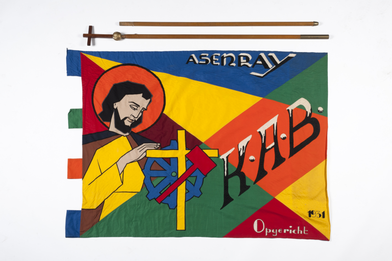 Links op de vlag is Sint Joseph afgebeeld. De heilige Jozef is patroonheilige van de timmerlieden en arbeiders in het algemeen. Naast de patroonheilige bevindt zich het symbool van de werkliedenbond, een kruis (het geloof) en de combinatie van een tandwiel en hamer (samenwerking tussen kapitaal en arbeid).