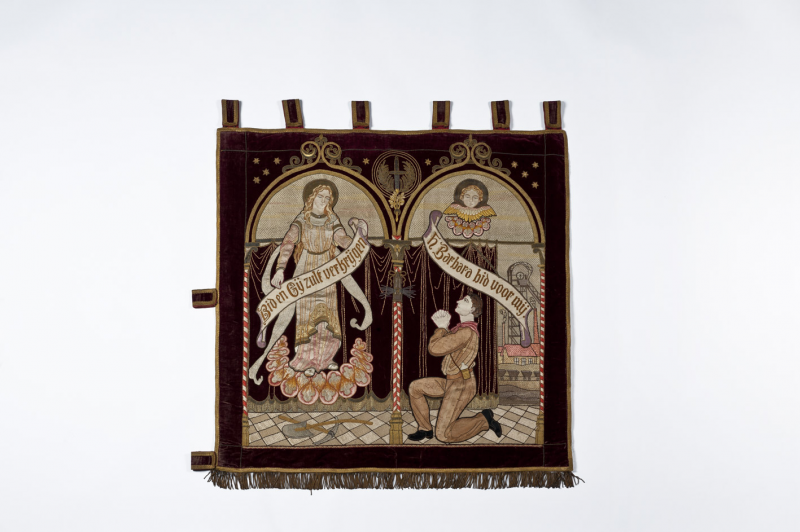 Voorzijde: Twee nissen waarin Maria op een wolk en een engel. Achtergrond een gordijn dat half openschuift met zicht op een mijnbedrijf. Op de voorgrond een tegelvloer met een knielende mijnwerker, gezicht naar Maria. Voor hem ligt een schop en houweel.