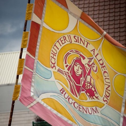 Gestileerd busteportret van de patroonheilige met haar atttributen (abdissenkromstaf en sluierende duif), omgeeven door cirkelvormig opschrift; het geheel in onregelmatige kleurvlakken met crème leegruimtes, de Maasstroom in een blauwe band aangeduid.