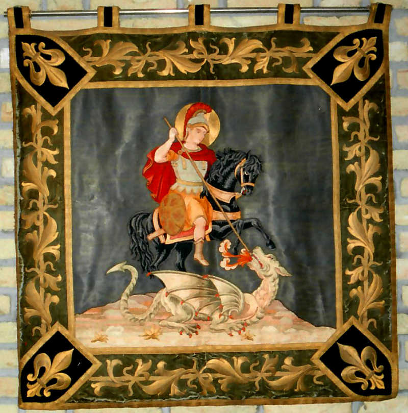 De voorzijde vertoont St. Georgè te paard, 'den draak bestrijdend, gewerkt op een fond van goud stof; er om heen loopt een rand van blauw fluweel rijk met goud bewerkt etc.