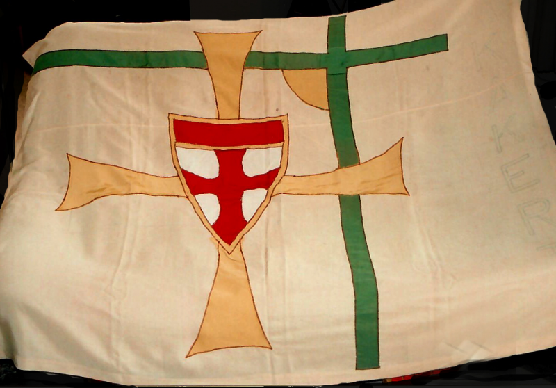 Embleem van de K.A.J. staat op de vlag, dus waarschijnlijk is het van een of andere arbeiders jongeren vereniging/groep. D.l.