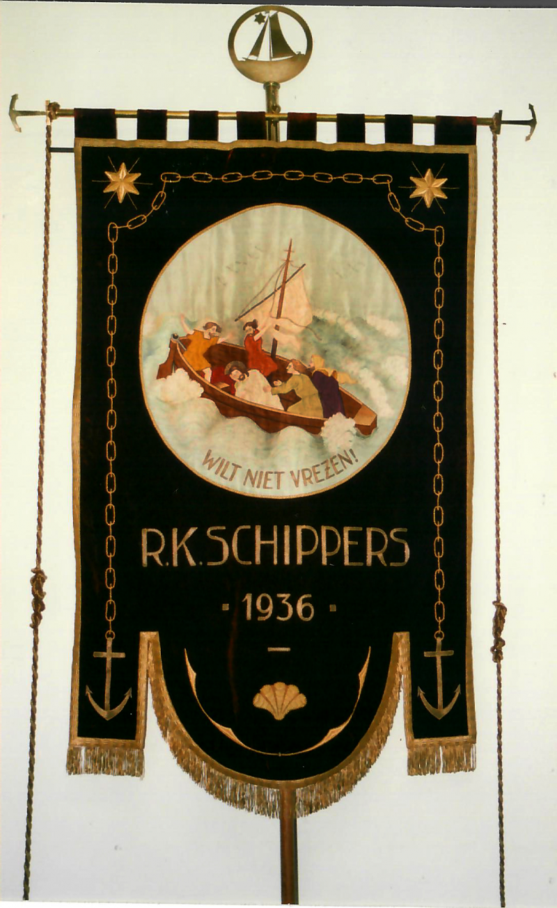 In het midden een medaillon met Jezus in de storm op het meer van Galilea in gezelschap van enkele vissers. Een ankerketting vormt een omlijsting van het vaandel. Verder sieren twee sterren het vaandel.