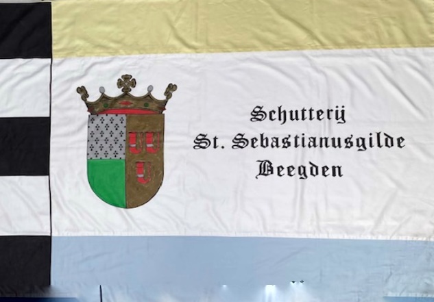 In de kleuren lichtgeel, wit en geelblauw en in het witte vlak het wapen van Beegden