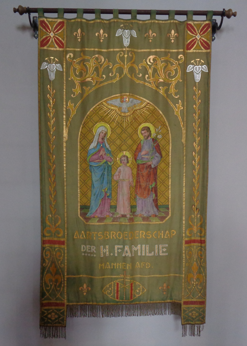 De teksten en de afbeelding zijn niet geborduurd, maar geschilderd. Hoogst waarschijnlijk door Morreau Maastricht. De afbeelding is een typische weergave van de H. Familie (Jezus, Maria en Jozef)