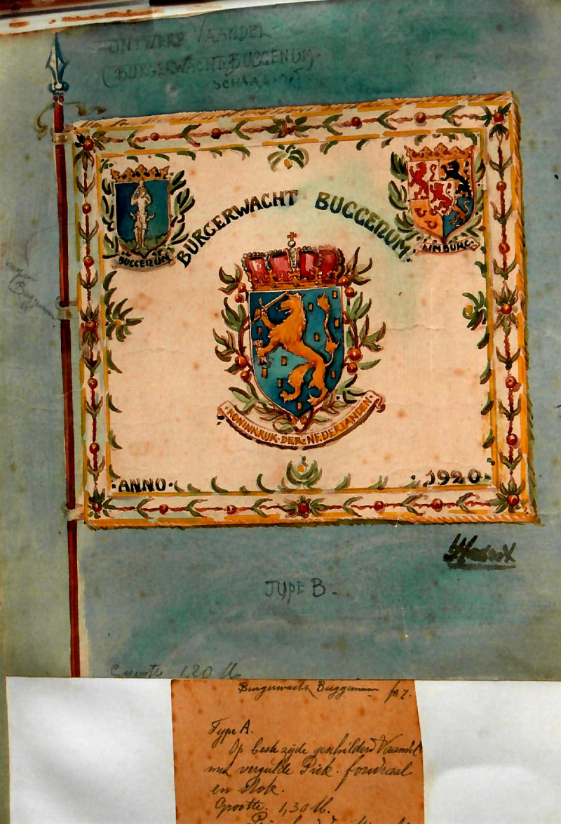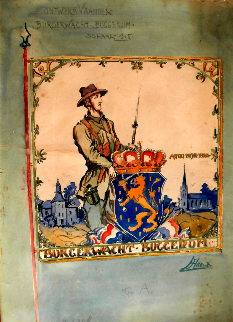 Waakzaam lid van de Burgerwacht achter wapenschil met de Nederlandse leeuw en voor het silhouet van Buggenum.