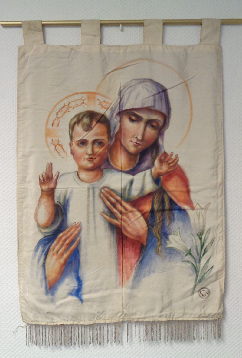 Het monogram KKW en kruisje zou kunnen staan voor Kerkelijke Kunst Wessling, beeldhouwer (en kunstschilder Arthur Nols).