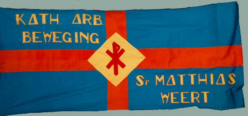 een kruis verdeeld de vlag in vier vlakken; de tekst staat in de vlakken l.b. en r.o.Op de kruising een ruitvormig vlakje met chiroteken.De belettering is in artdeco stijl uitgevoerd.