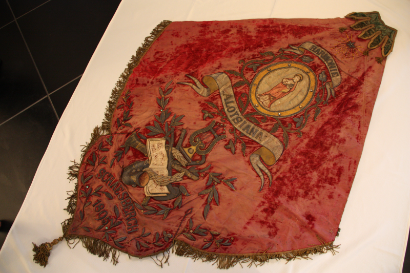 Op oude foto’s staat op het vaandel de plaatsnaam als “Schaesberch” gespeld.