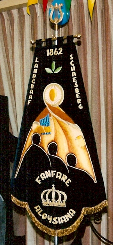 Een sterk gestileerde St. Cecilia met montrans in plaats van gelaat, en voor haar mantel de silhoutten van drie (gestileerde) muzikanten, symbolisceh voor de drie generaties in de vereniging.
