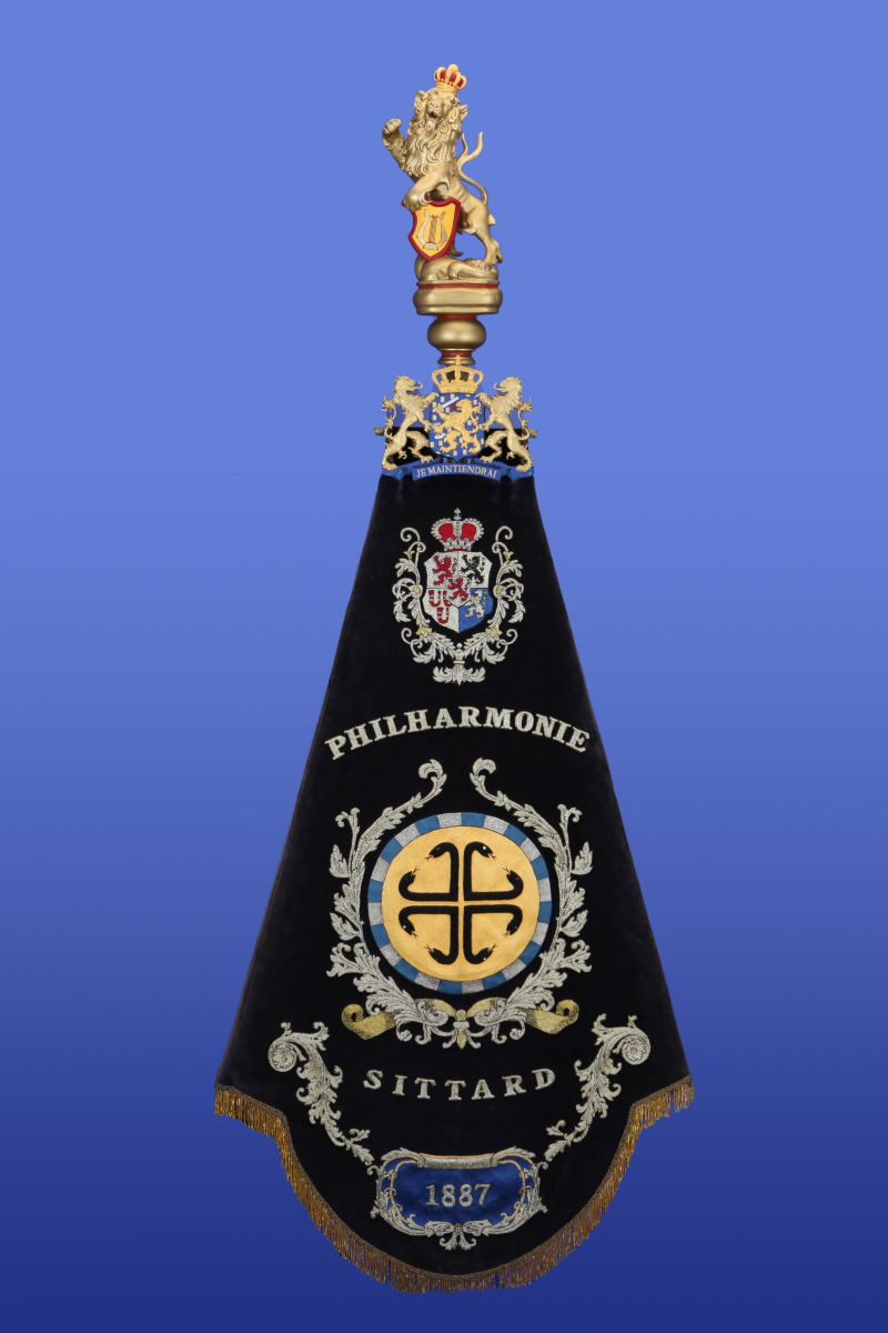 Aan de bovenzijde van het doek is het wapen van de provincie geborduurd. Onder de naam ‘Philharmonie’ is het wapen van de gemeente Sittard aangebracht, wederom rijkelijk versierd met eikenloof en lauwertakken. De plaatsnaam Sittard en het jaar van oprichting (1887) completeren de drapeau.
