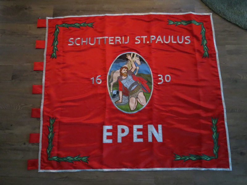 In een ovalen cartouche de patroonheilige in Romeinse legertuniek tijdens zijn Damascus-bekering. Groene lauwerkransen in de vier hoeken