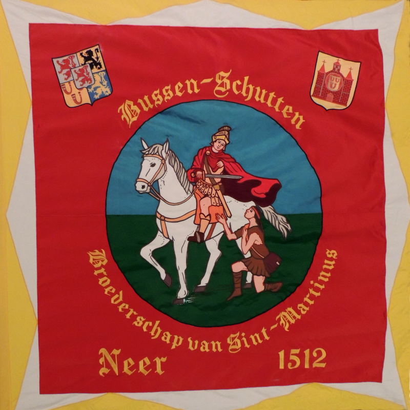 In een ronde catouche de patroonheilige te paard die zijn mantel deelt met een knielende bedelaar, op een groen veld onder een blauwe hemel. Daaromheen in een rood veld het provinciewapen van Limburg en het wapen van de voormalige gemeente Neer. Daaromheen een boord in de pauselijke kleuren.