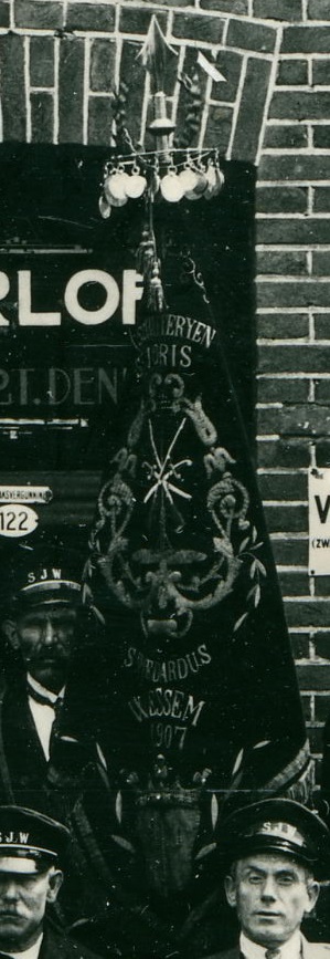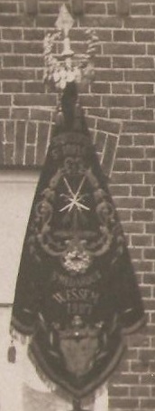 Roodfluweelen drapeau, waarop in goud geborduurd: St. Joris / en St. Medardus / Wessem / 1907, schietboom met de bolletjes (doch op losse ra's, niet binnen een raam), gekruiste geweren en sabels; onderaan 't wapen van Horne; goudgalon en 3 kwasten.