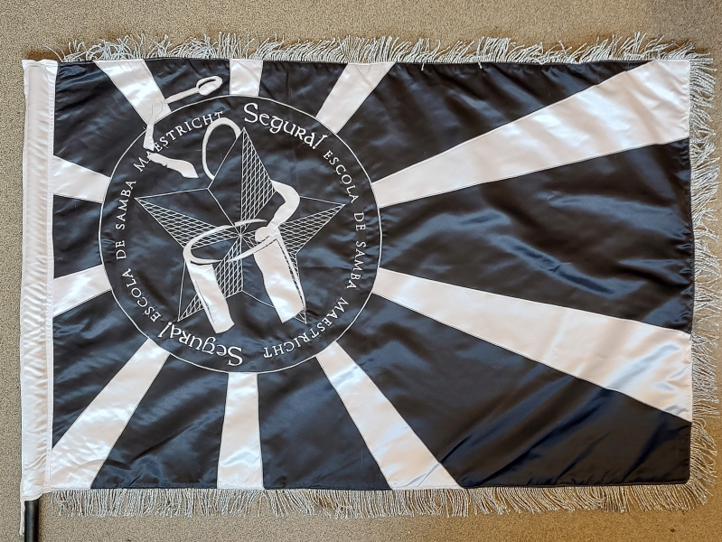 In een zwarte cirkel wit omlijst een stylistisch getekend persoon die surdo speelt gepositioneerd achter de Maastrichtse ster. Tegen de buitenrand drie maal de tekst "Segura! Escola de Samba Maestricht". Het geheel vertikaal gecentreerd en horizontaal op een derde van vlaggestok geplaatst op een veld van afwisselend zwarte en witte naar buiten toe breder wordende banen die voortkomen van achter de cikel.