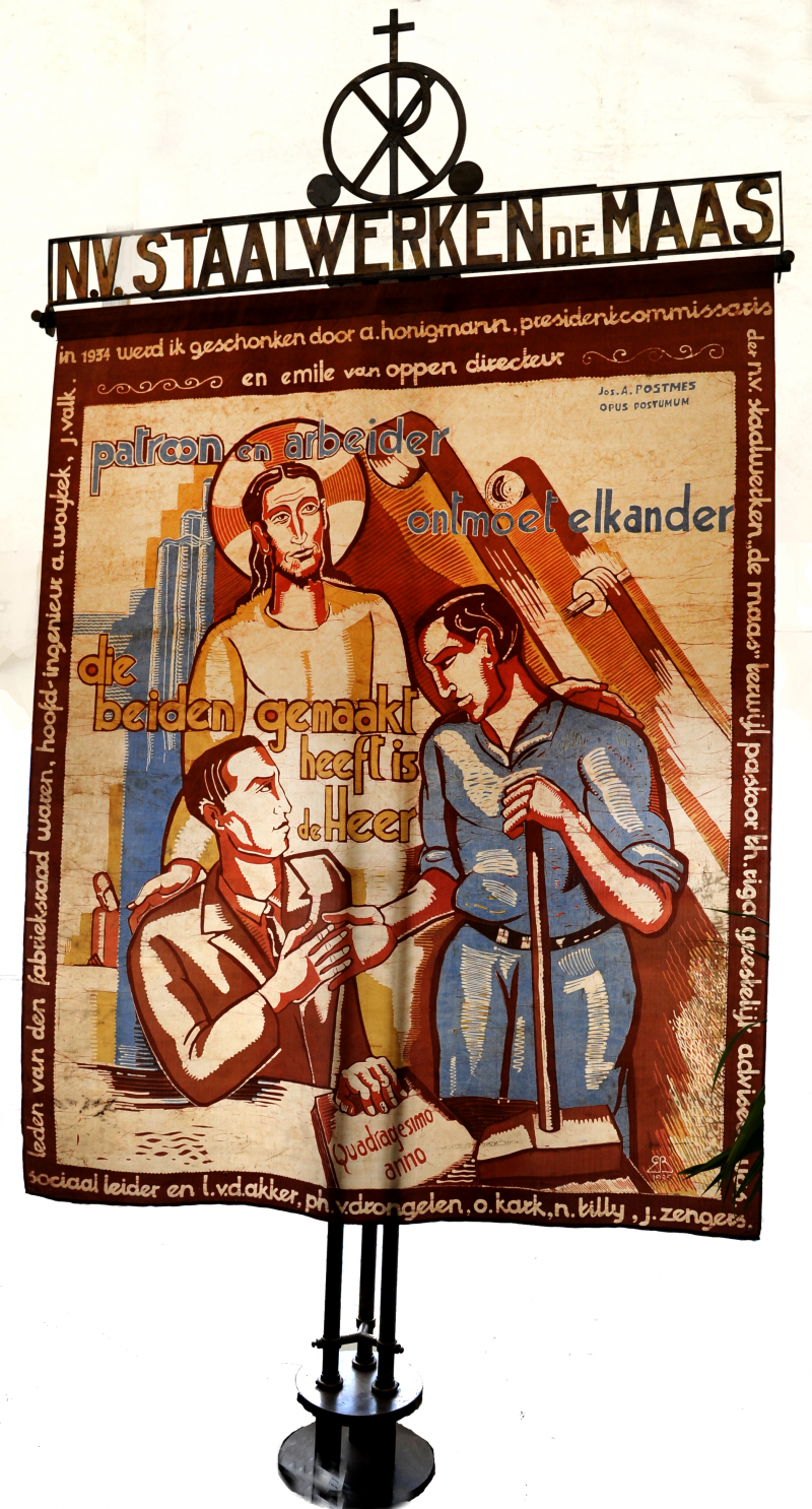 Centraal afgebeeld drie figuren, werkgever en arbeider schudden elkaar de hand. De werkgever met encycliek Quadragesimo anno, de arbeider met een voorhamer; Christus staat in een beschermende houding achter beiden. Op de achtergrond een aantal industriële elementen die wijzen op de buizenproductie van Staalwerken. De omlijsting wordt gevormd door tekst waarin de schenkers staan genoemd.