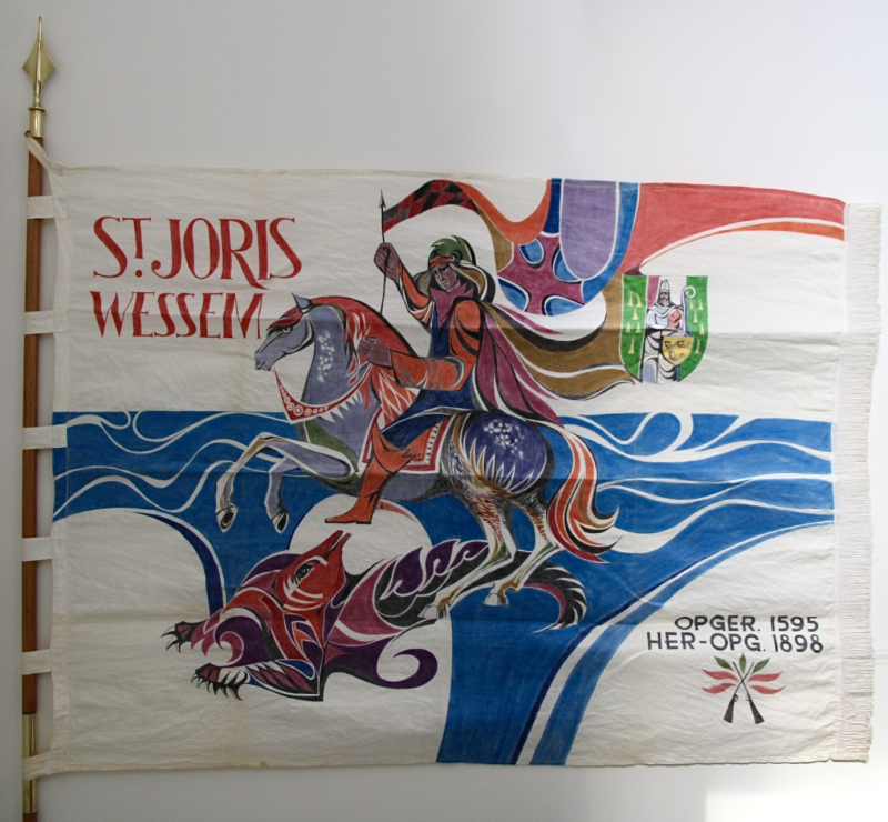 Het wapen van Wessem is als het ware verwerkt in de mantel van Sint Joris.