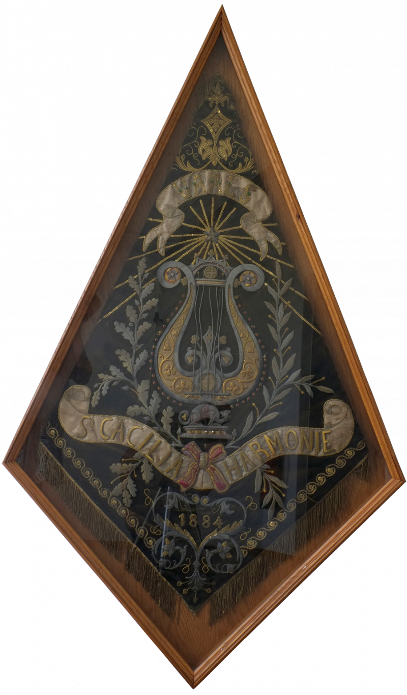 Da der Verein bis dahin noch nicht im Besitz einer Vereinsfahne war, so entstand bei den Mitgliedern das Verlangen, ebenfalls eine solche zu besitzen, und wurde beschlossen zu diesem Zwecke, dass jedes Mitglied einen wöchentlichen extra Beitrag von 1/2 Frank zu zahlen habe, welches dann auch mit Begeisterung angegangen wurde. Späterhin jedoch wurde der Beitrag auf 10 Pfg reduziert. Das Geld welches in Geschäften verdient wurde, wurde auch zu diesem Zwecke verwandt, ebenfalls wurde dafür am 25. Nov. 1883 ein Concert abgehalten. Nachdem nun soweit der Kostenbetrag zusammengebracht war, wurde die Fahne in Lüttich in einer der berühmtesten Fahnenfabriken bestellt, welche dieselbe dann auch im Mai 1884 zum Preise von 625 Frs. tadellos ablieferte.