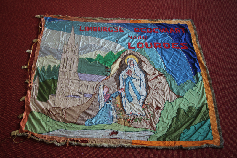Bernadette in aanbidding voor de Mariaverschijning met de Lourdesbasiliek op de achtergrond. De extra-afbeeldingen tonen wimpels die vanuit diverse Limburgse locaties werden meegevoerd: Sterre der Zee, OLV in’t Zand, Klein Lourdes Tienray (vervaardigd in 1935).