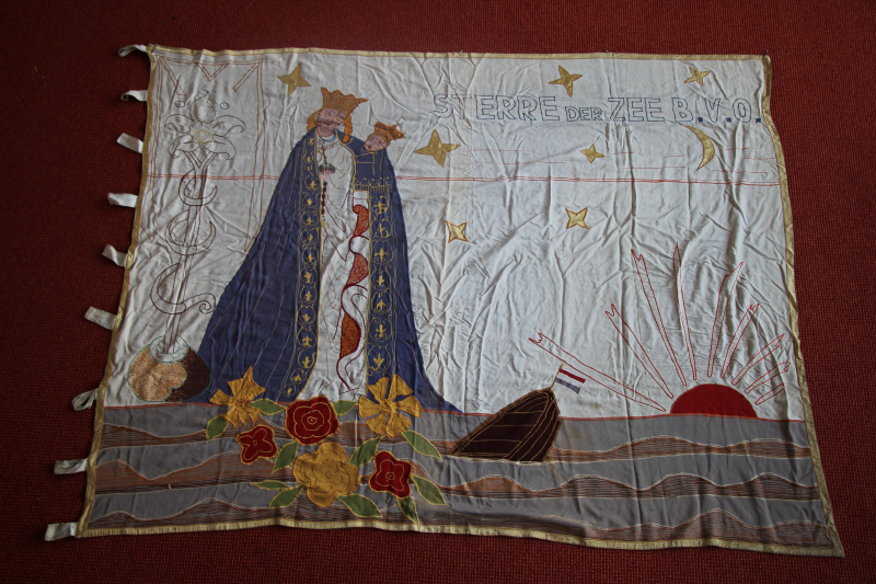 Het genadebeeld van de Sterre der Zee staande op bloemen, vooe de achtergrond van een zeelandschap waarop een bootje met de Nederlandse vlag in zwaar weer verkeert; onder- of opgaande zon.