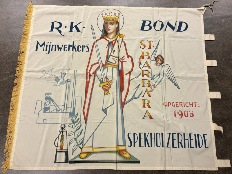 De H. Barbara met torentje en martelarenzwaard, aan haar voeten een mijnlamp en een palmtak. Rechts een Engels die de letters van haar name vasthoudt, links het silhouet van een mijn.