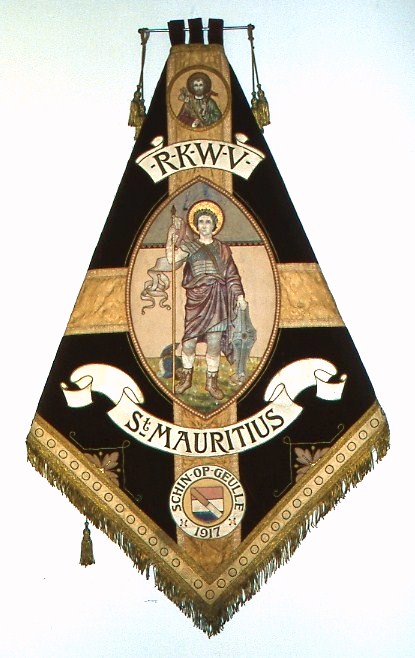 De achtergrond wordt gevormd door een kruis met brede balken doorlopend naar de achterkant. Daarop staat van boven naar beneden een aantal applicaties. Van boven naar beneden zien we de volgende applicaties: een klein rond medaillon met een buste van St. Jozef met zijn attributen, daaronder een banderol met de verenigingsnaam. Centraal op de kruising is St. Mauritius als Romeins militair afgebeeld in een mandorla met daaronder een tweede tekstbanderol. Onderaan staat een rond medaillon met plaatsnaam en het schild van de (in 1910 opgeheven) Volksbond. De hele onderkant is afgezet met een decoratieve rand en goudfranje. Drie lussen aan de bovenkant.