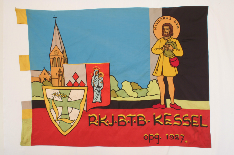 Voor een gestileerd landschap staat St. Isidorus op een rood tekstvlak. Rechts op de voorgrond twee schilden; respectievelijk het schild van de jeugdbeweging en een schild met het gemeentewapen van Kessel. Daarachter staat de kerk van Kessel. In het rode vlak langs de onderkant staan de initialen van de verenigingsnaam, plaats en oprichtingsdatum. In het aureool van Isidorus staat H. ISIDORUS b.v.o. Links drie lussen waarvan de onderste sterk verbreed is.