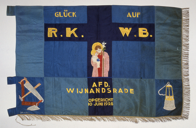 De vlag is ingedeeld in een aantal rechthoeken met centraal geplaatst een Latijns kruis waarin St. Joseph met attributen en het kind Jezus staat afgebeeld. Linksonder staat het gereedschap van de timmerlieden en bouwvakarbeiders, winkelhaak, hamer, zaag en troffel. Rechts staat het symbool van de mijnwerkers, de mijnwerkerslamp. Afwerking met fijne goudfranje.