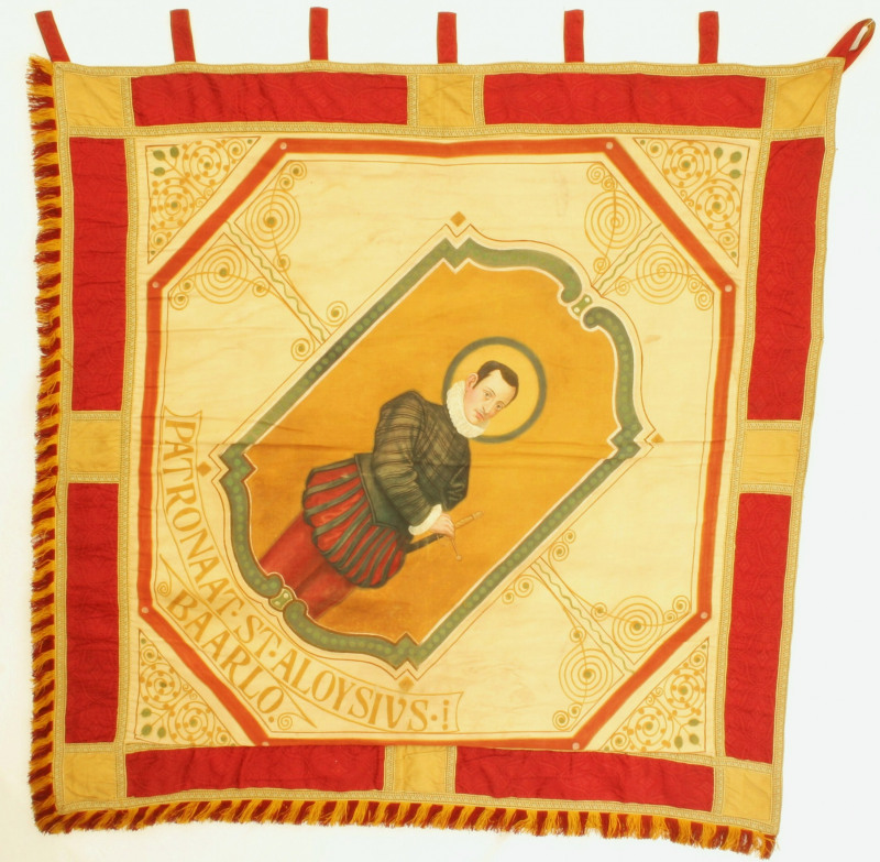 Diagonale voorstelling van St. Aloysius met zwaard, gekleed in 17e eeuws Spaans kostuum in een lijst geplaatst. Het portret is voorzien van een tweede diagonale lijst met eromheen Jugendstill motieven. De afwerking van het geheel wordt gevormd door een contrasterende lijst in twee kleuren. De twee onderkanten hebben een tweekleurige zijden franje. Het vaandel heeft zeven lussen.