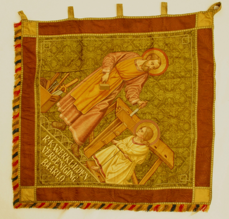 Diagonale voorstelling met St. Jozef als timmerman en kind Jezus. In de punt staat de verenigingsnaam. De achtergrond wordt gevormd door damast. Het vaandel is omlijst door contrasterende kleurbanen. Onderkant driekleurige zijde franje. Linksboven vijf lussen.