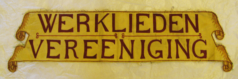 Centraal is in een cirkelvormig medaillon een afbeelding van Jozef met de attributen. In de linker- en rechter?baan zijn gereedschappen afgebeeld die de verschillende beroepen van de bouwvakvereniging vertegenwoordigen: timmerman, grondwerker, mijnwerker, metselaar en schilder. In tekstbanderollen verspreid over het vaandel staan naam, plaats en datum vermeld. De onderkant van het vaandel wordt (tussen de slippen aan de zijkant) gevormd door drie lobben; dit vlak is opgevuld met een bloesemtak en het jaartal. De slippen en lobben lopen van links naar rechts op. Opvallend is het spoor van een banderol bovenlangs; dit bevindt zich daar waar de tekst BOUWVAK VEREENIGING staat. De tekst Vvervangt blijkbaar een een eerdere tekst WERKLIEDEN VEREENIGING. Lussen aan boven- en linkerzijkant.