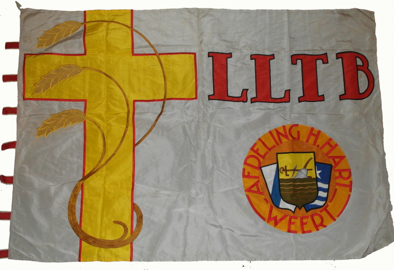 Tegen een lichte achtergrond is links een groot kruis geplaatst waaromheen enkele korenhalmen slingeren; in het verlengde van de horizontale kruisbalk staan de letters LLTB. Rechtsonder staat een cirkelvormig embleem met drie wapenschilden. In de cirkel staat de afdelingsnaam. De schilden vertegenwoordigen de stad Weert, de verenigde boeren en het bisdom Roermond (Stella Duce van Mgr. Lemmens)